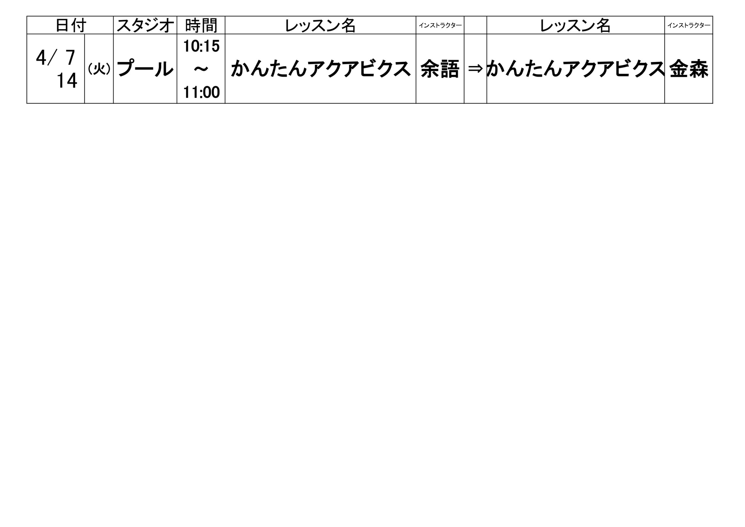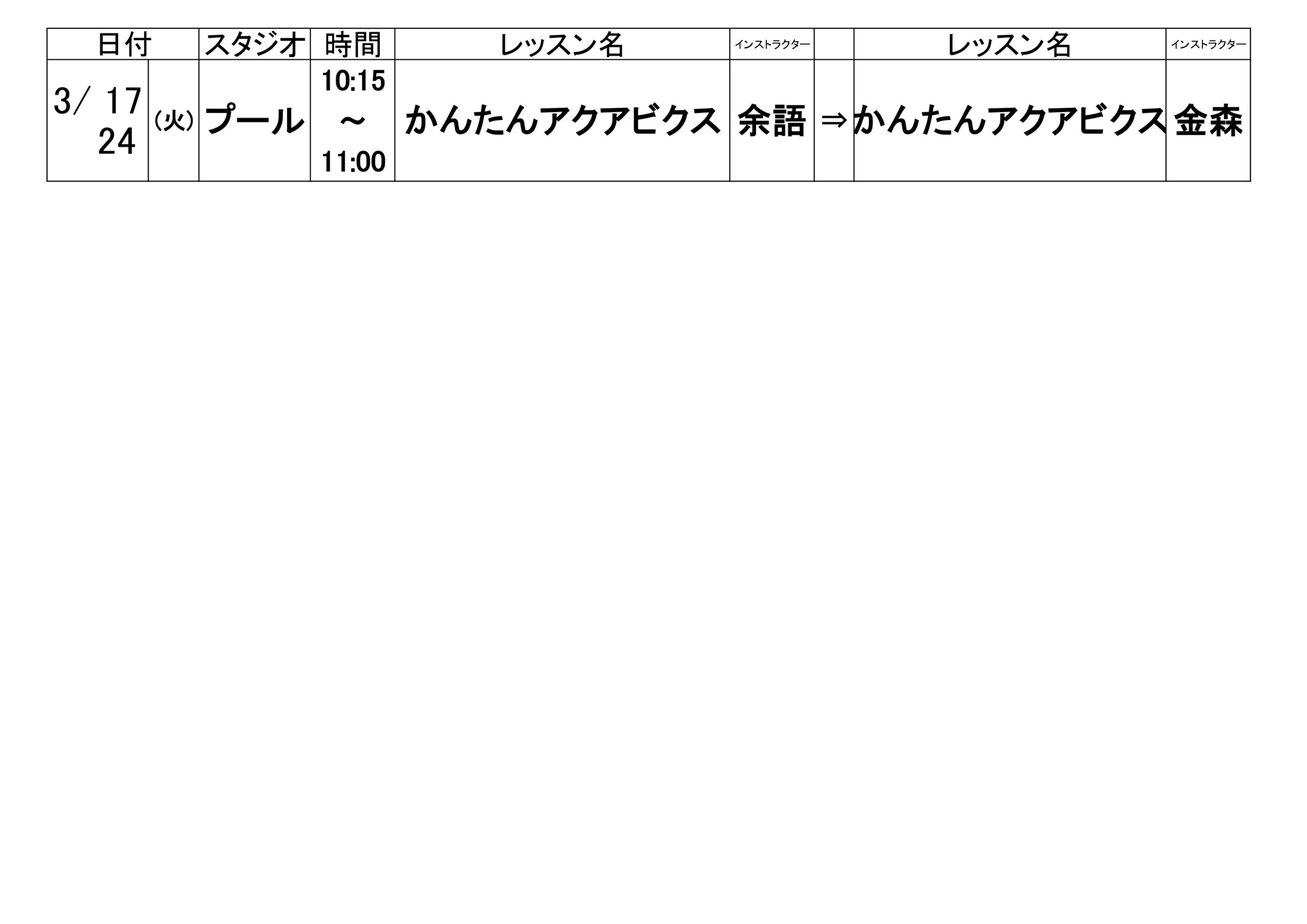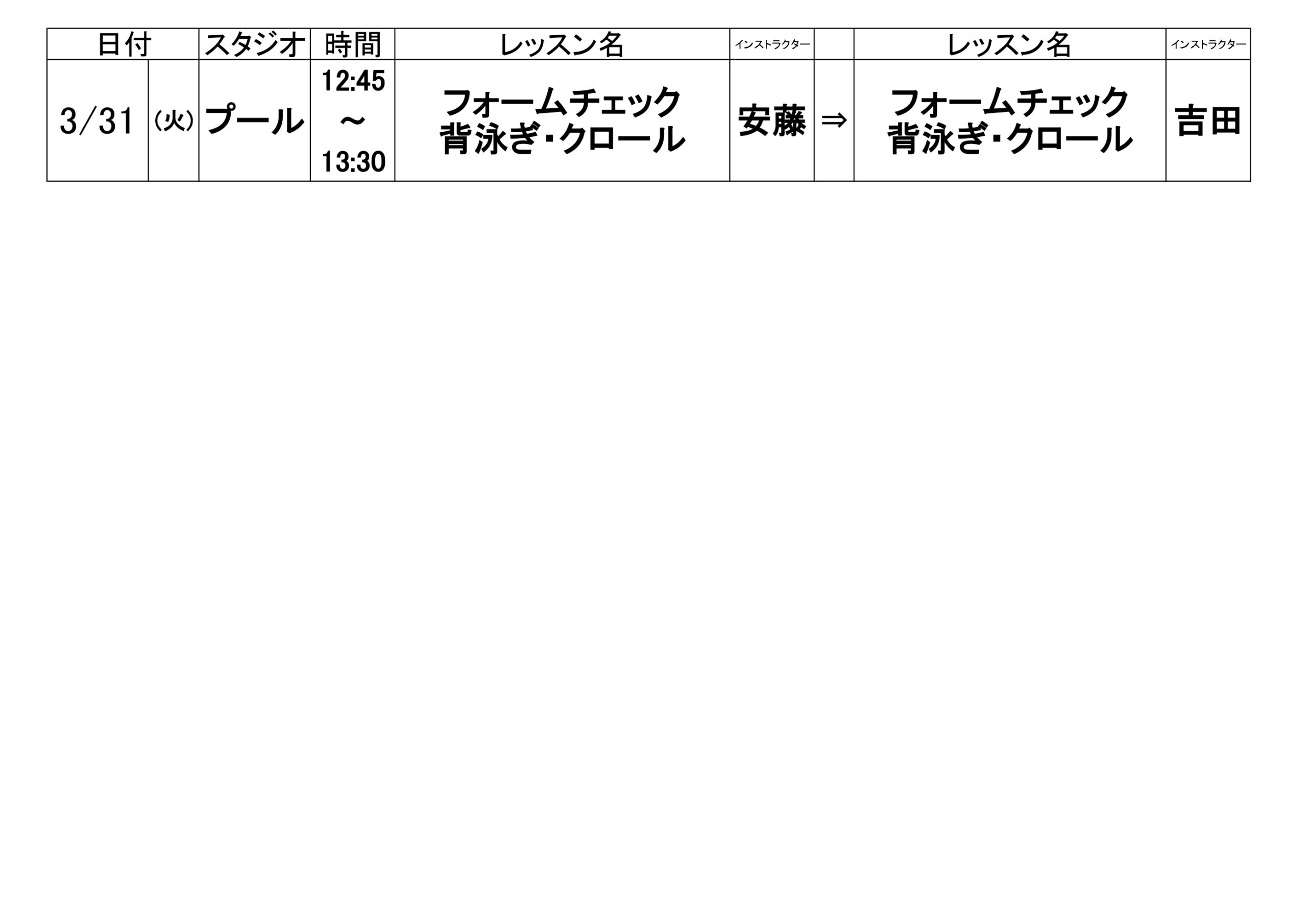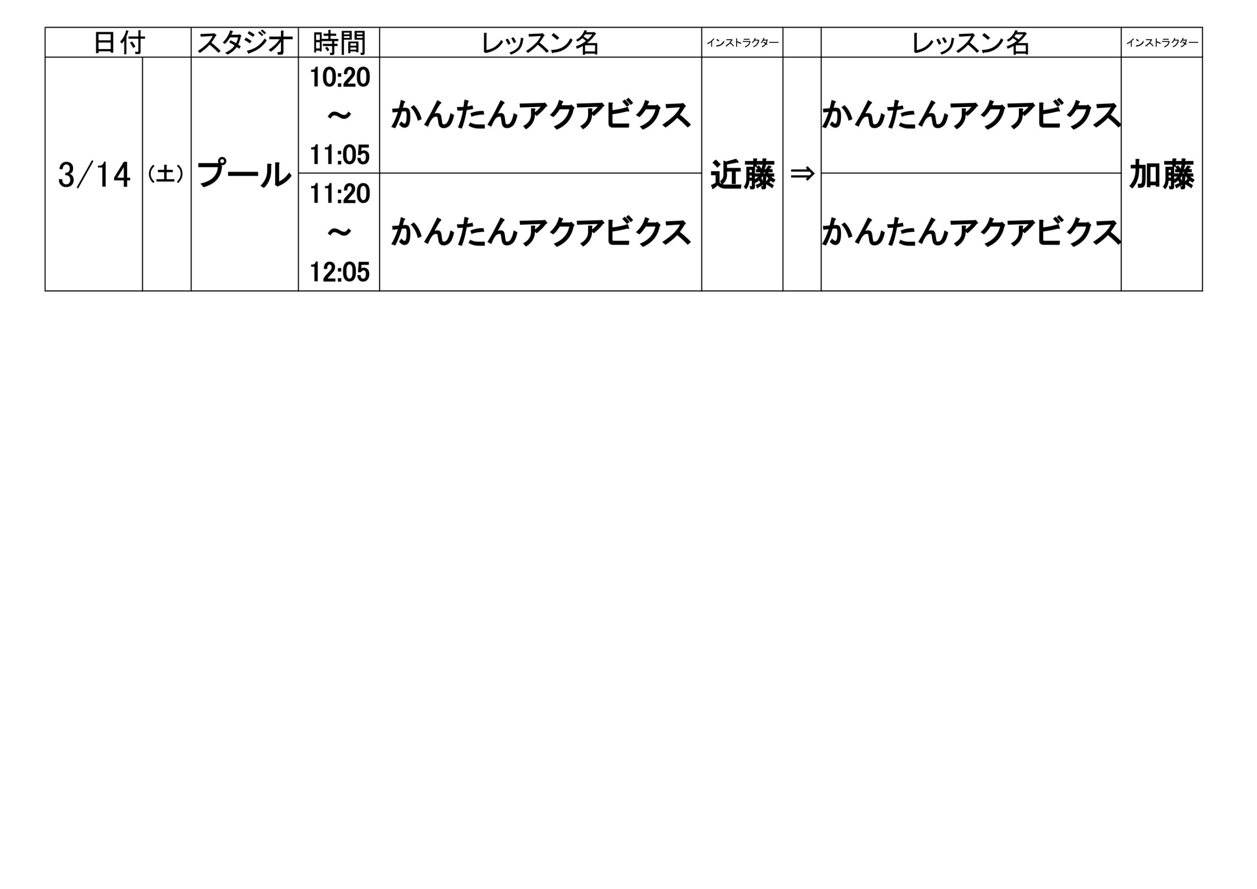 皆様こんにちは。 3/14(土)のレッスン代行のご案内です。 急な代行となり、申し訳ございません。 担当インストラクターが決まりましたので、 お知らせいたします。 ご確認ください。